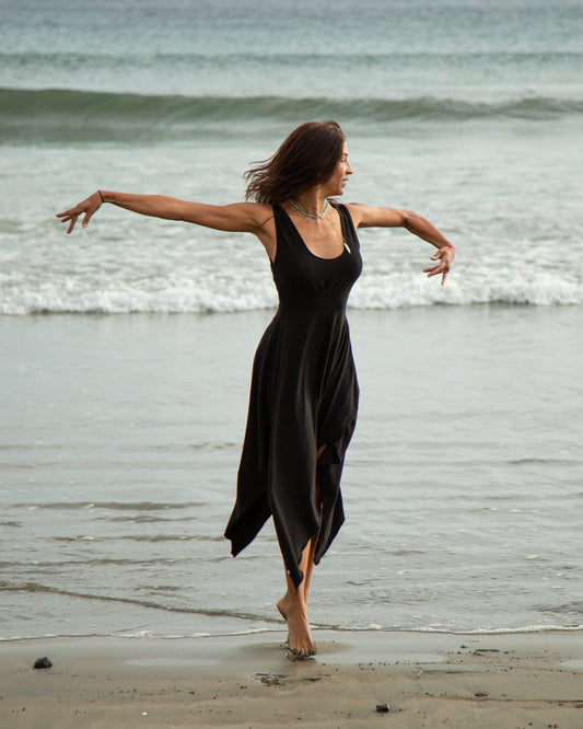 We are honored to offer you our "Deep Stretch" dance pants and black flowing Dance Dress created exclusively for Gabrielle Roth's 5Rhythms with the special golden embroidered 5rhythms logo.