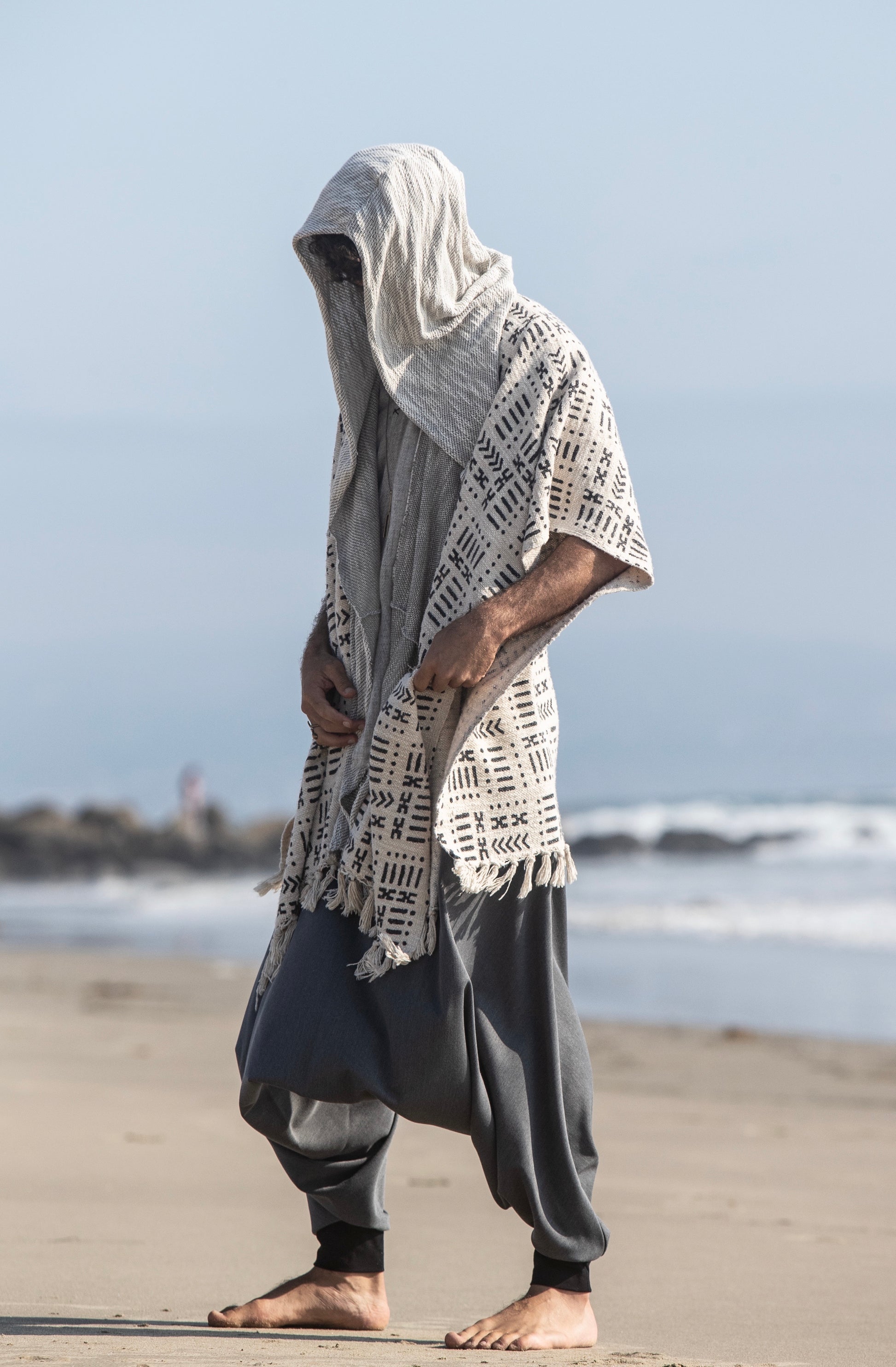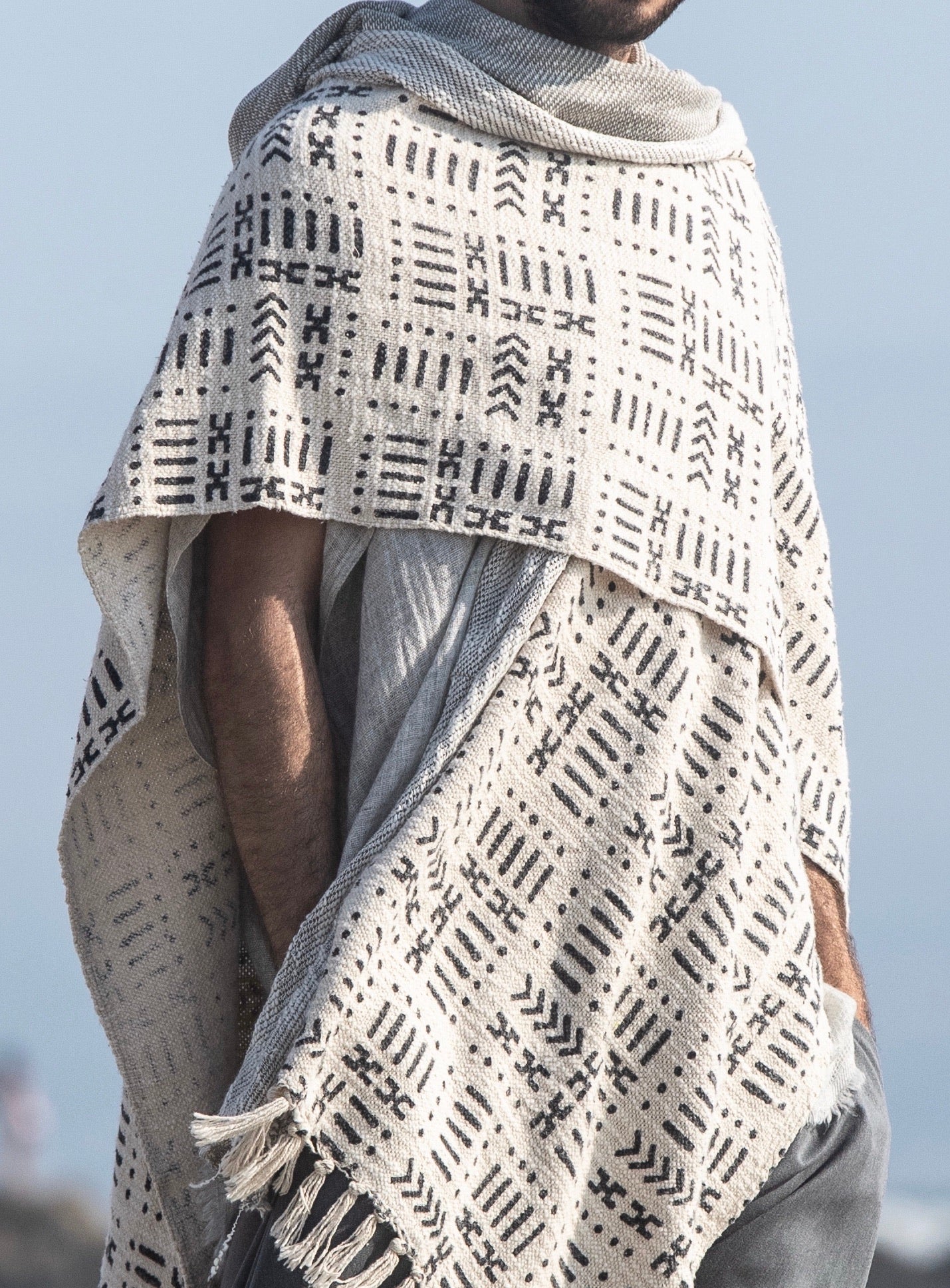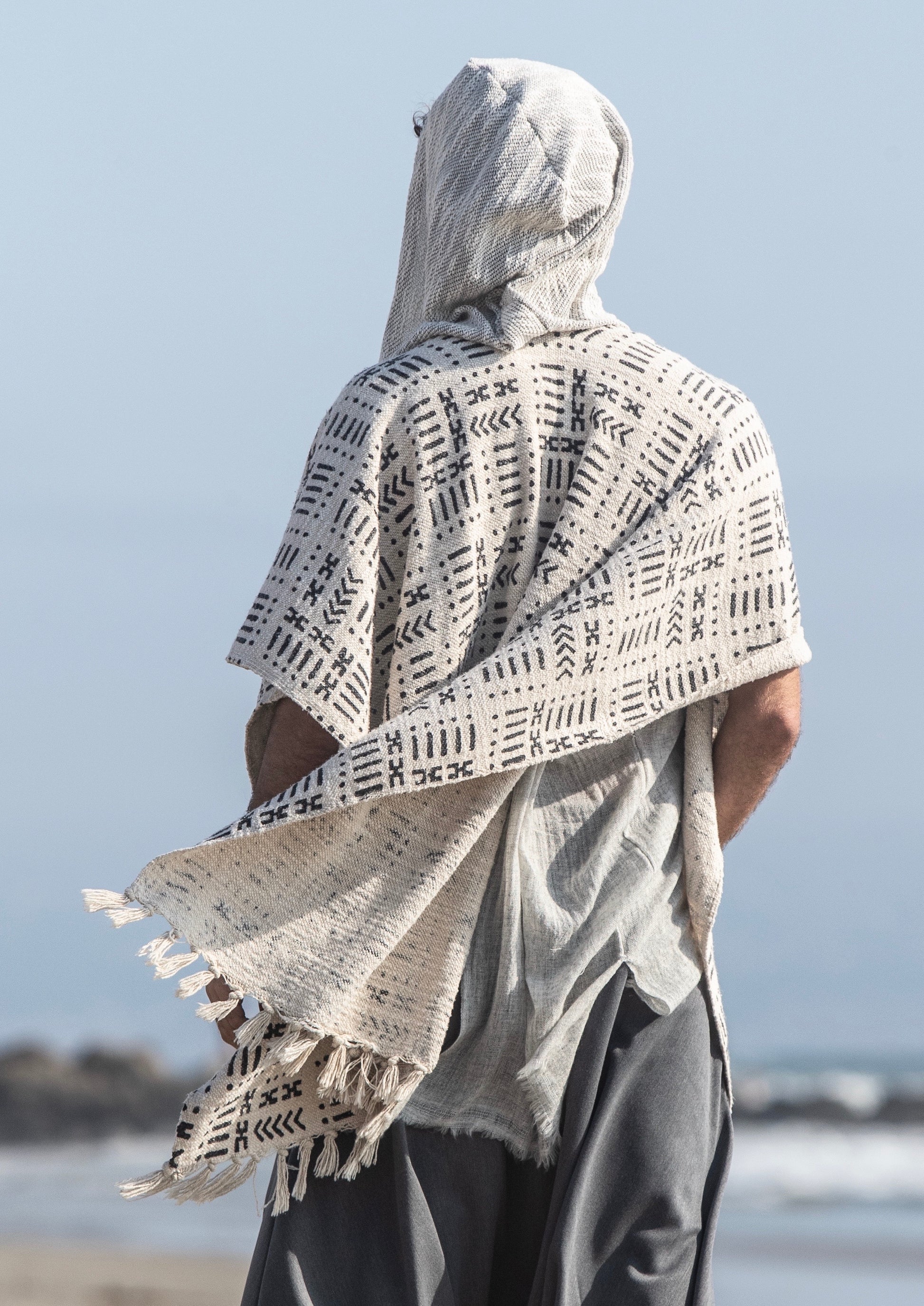 Nomad style poncho with the hood, handmade from 100% handwoven and hand-block printed cotton and cotton jersey.