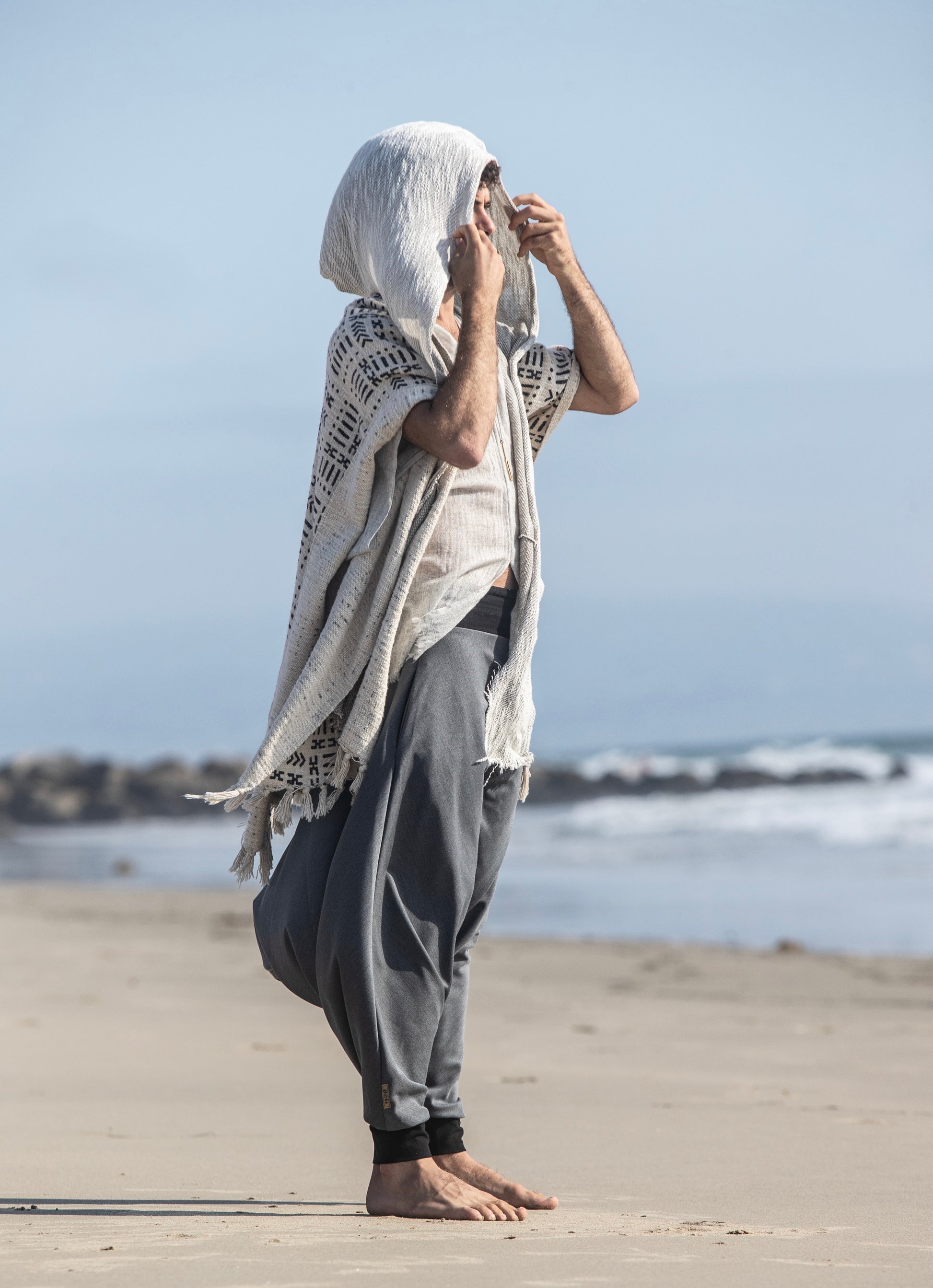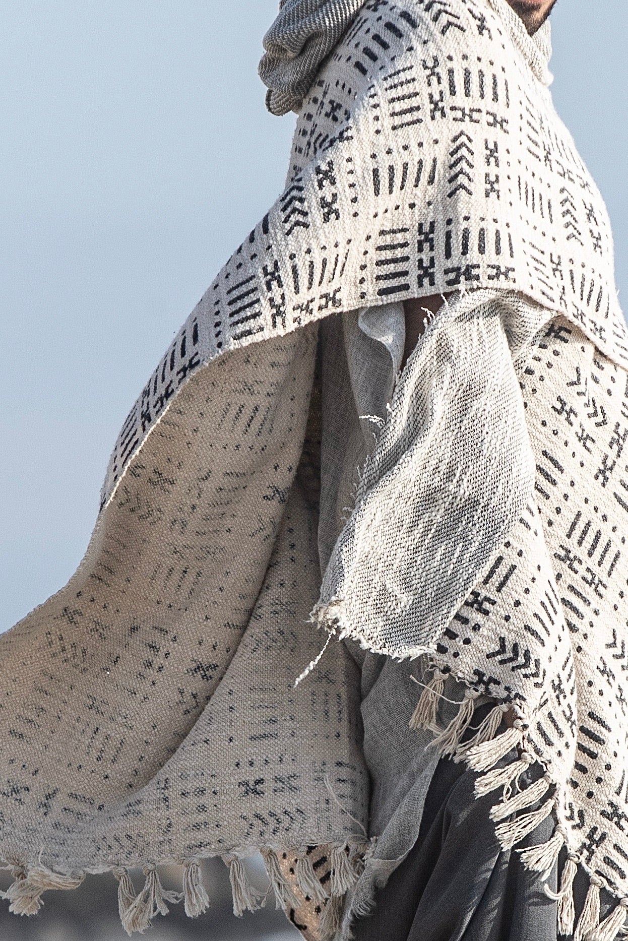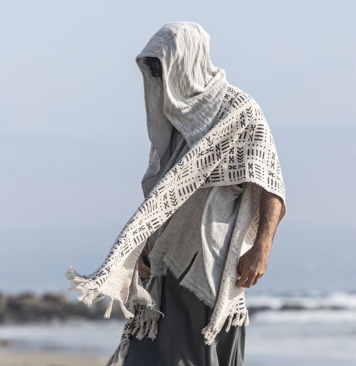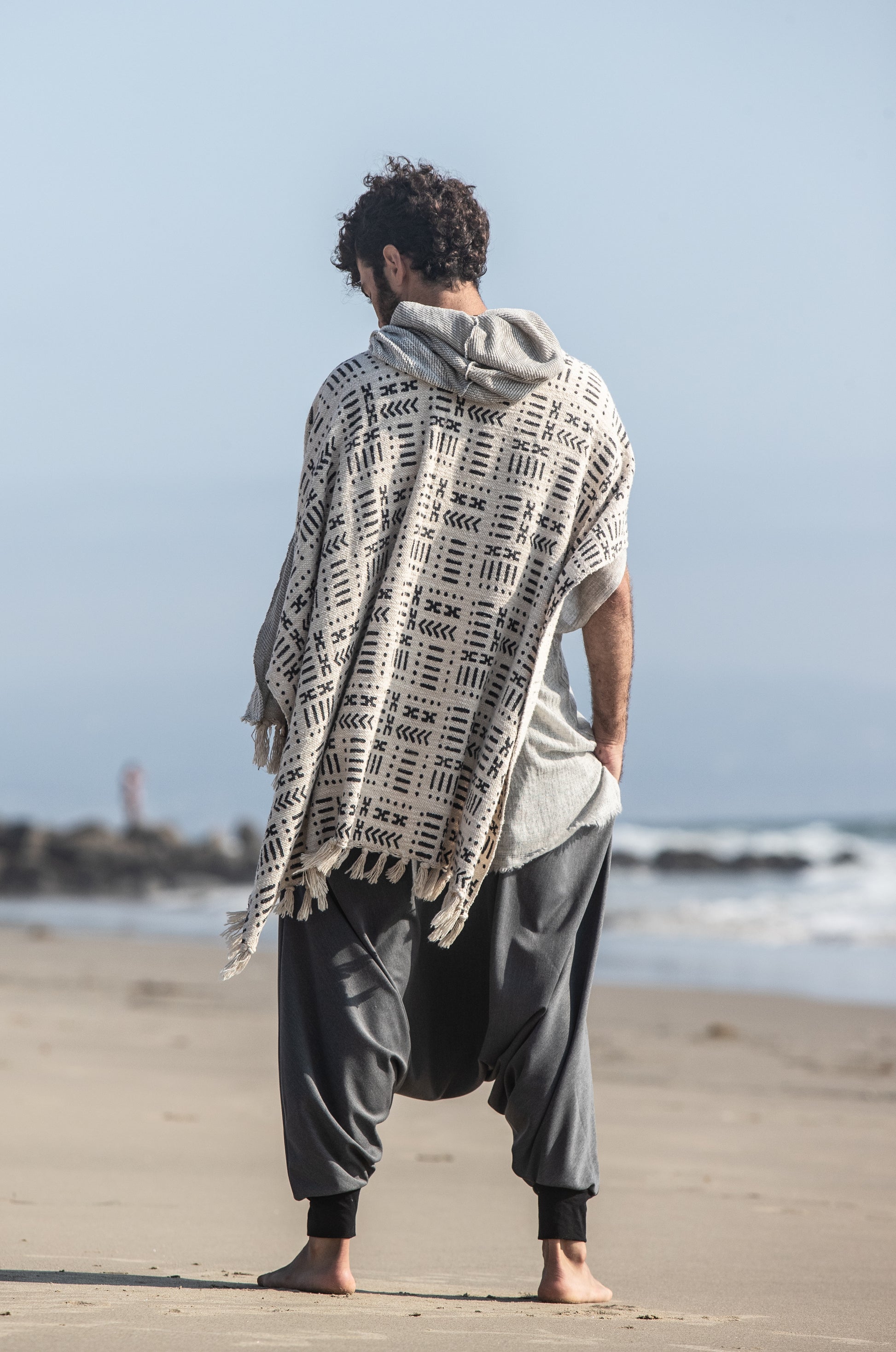 Nomad style poncho with the hood, handmade from 100% handwoven and hand-block printed cotton and cotton jersey.