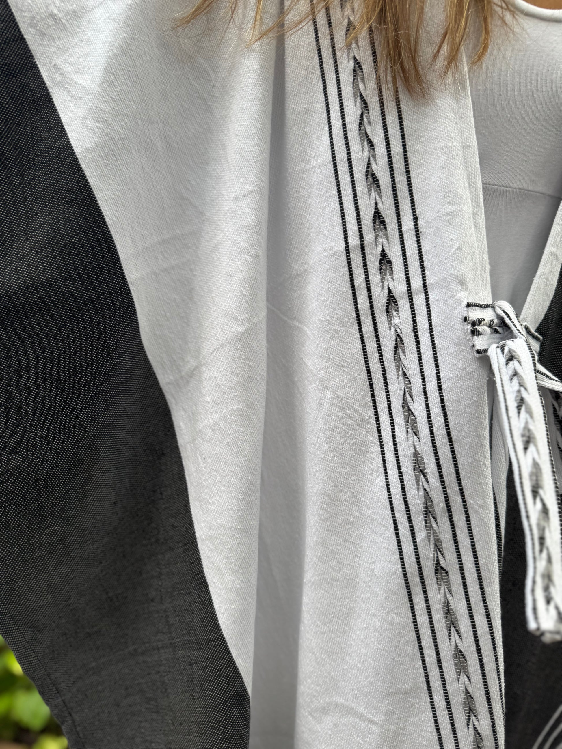 Handwoven in Oaxaca, this absolutely gorgeous 100% cotton poncho carries the spirit of Ceremony and tradition. Its long flowing drape creates an elegant look and presence, while the braided accent symbolizes connection and continuity—an intentional piece for sacred moments and everyday ritual.