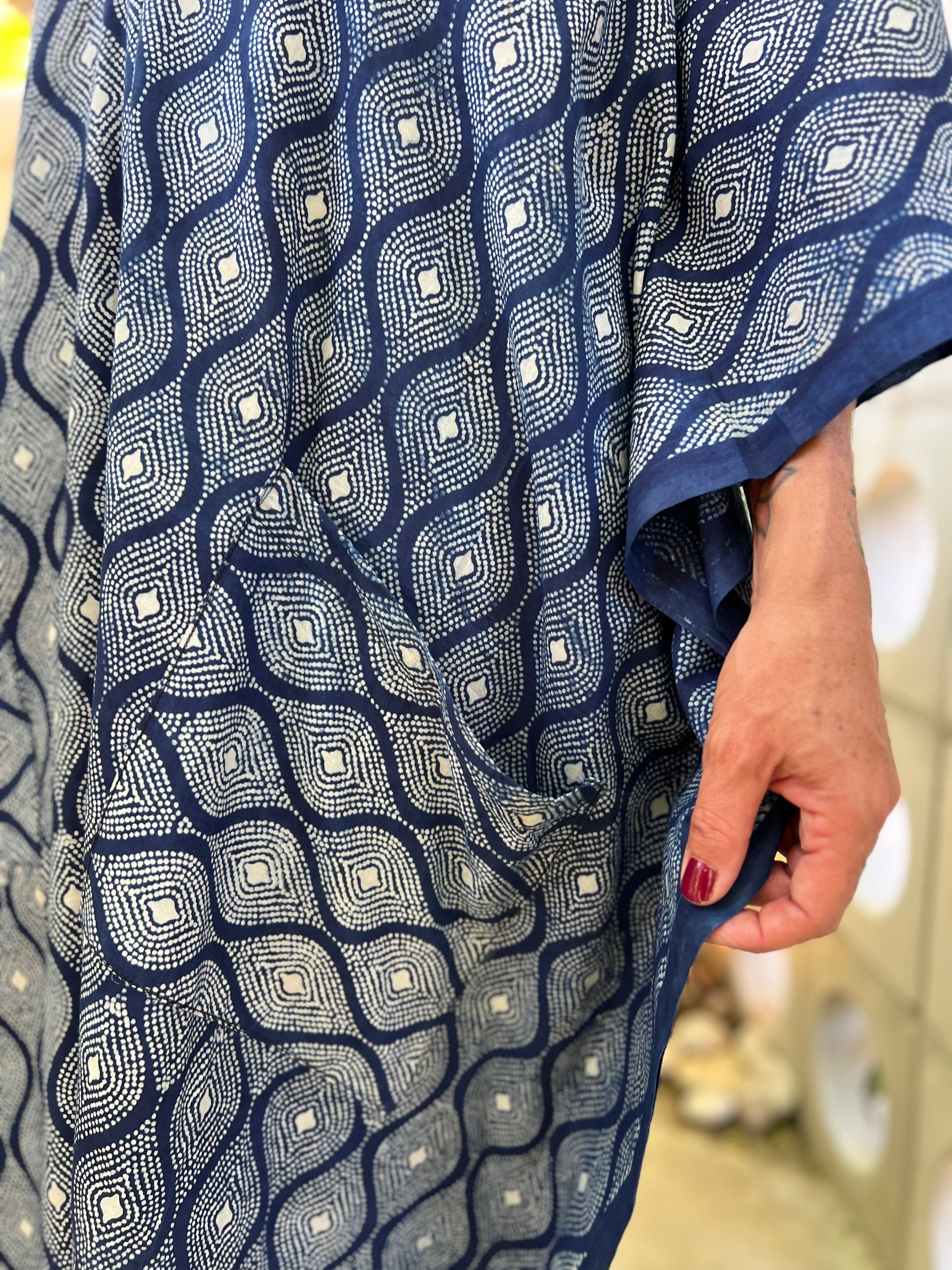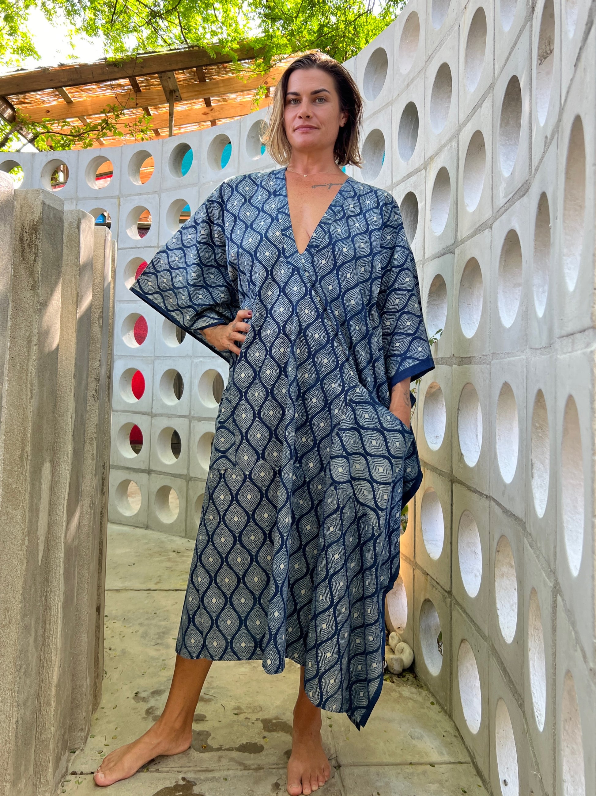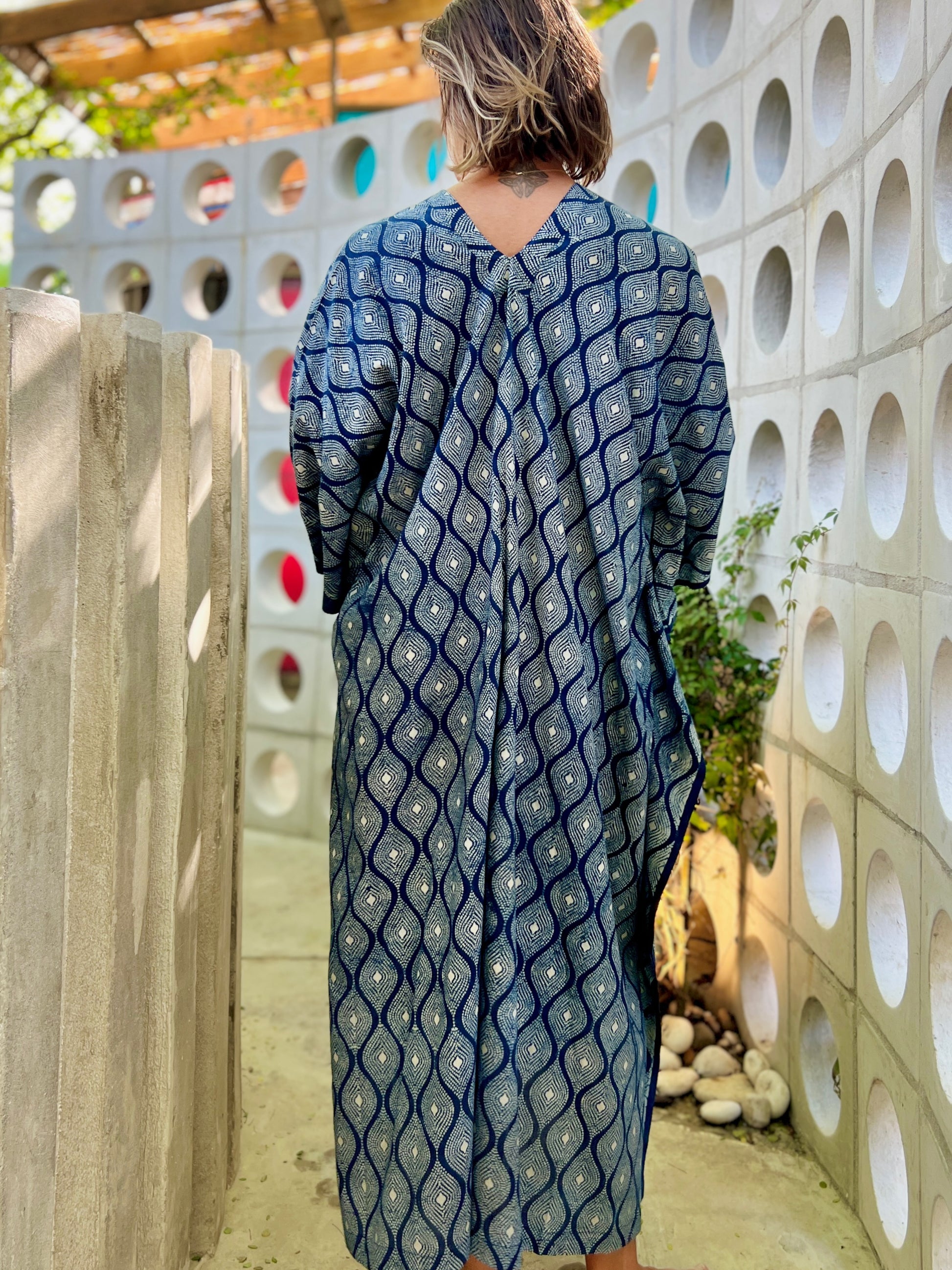 Beautiful Indigo dyed 100% Cotton Caftan Dress with a hand-block print.