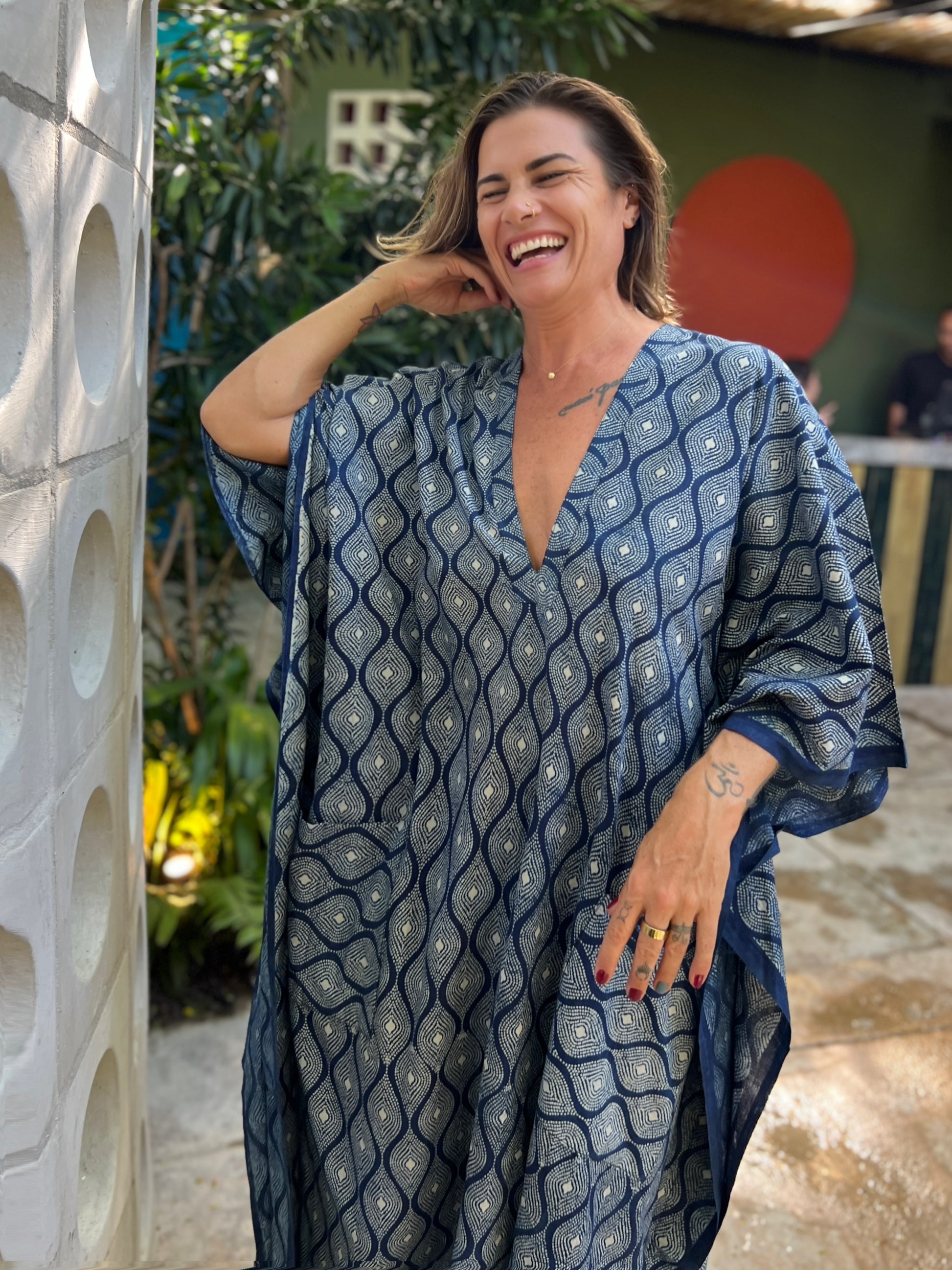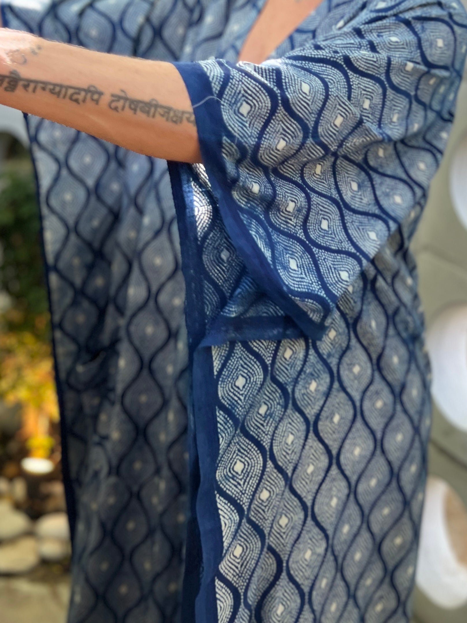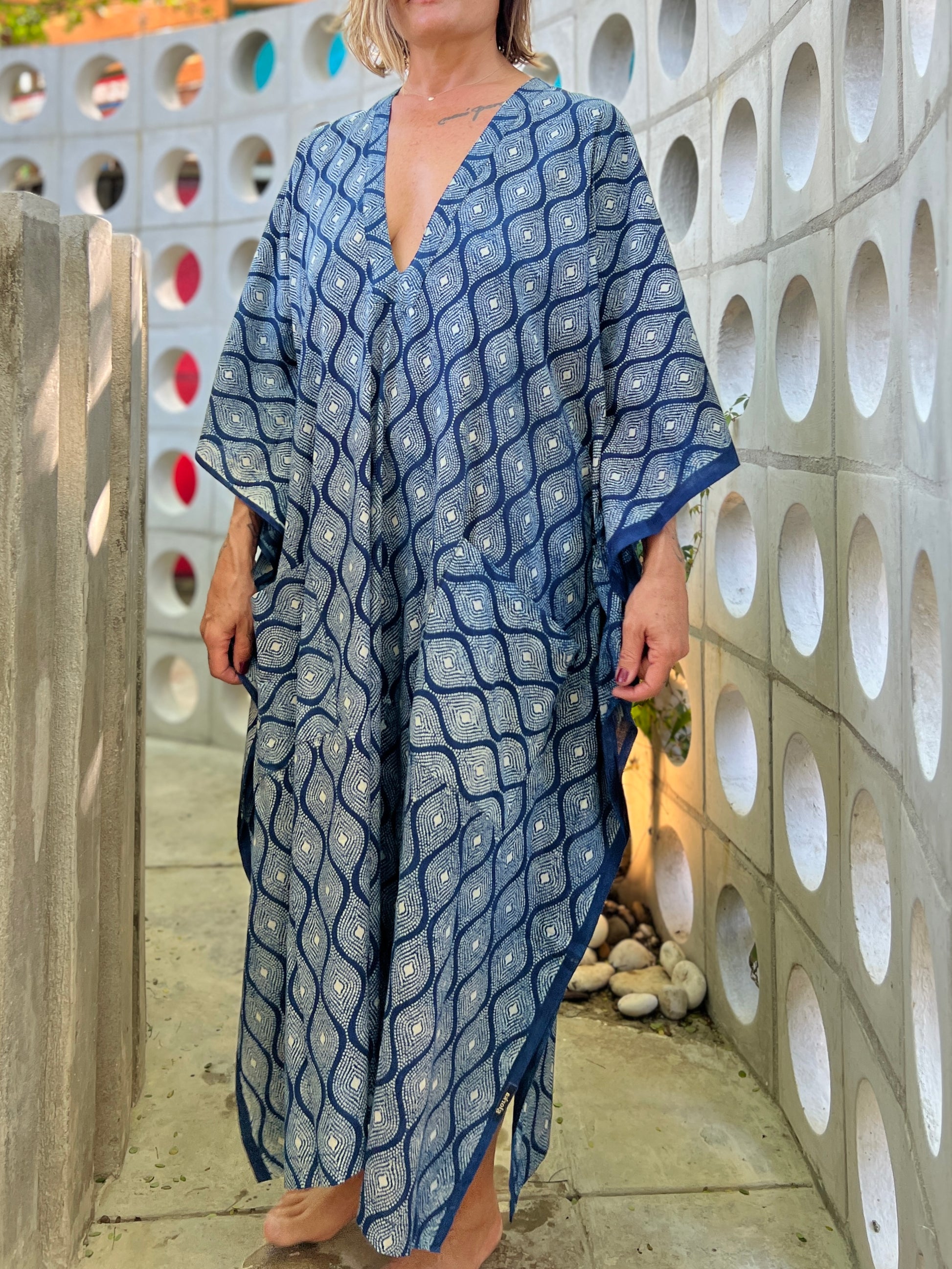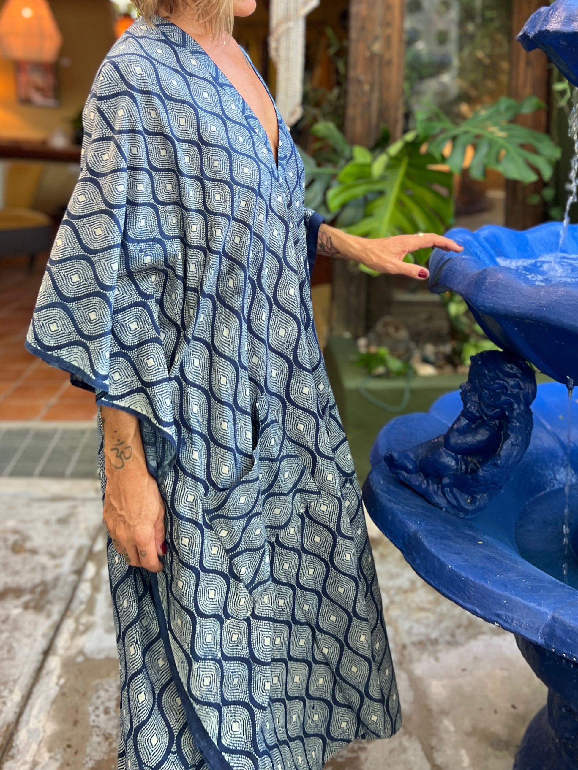 Beautiful Indigo dyed 100% Cotton Caftan Dress with a hand-block print.