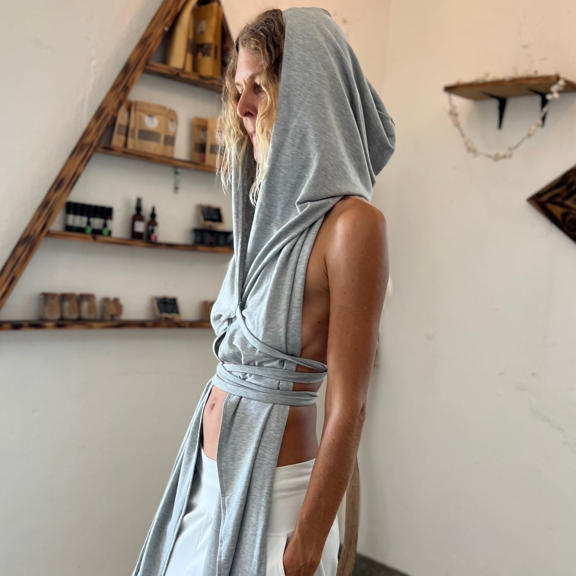 Elevate your look with our handcrafted, futuristic yet ancient, hooded top.  Designed with pure Intention and love frequency to raise your vibration at the mindful gatherings and daily rituals.