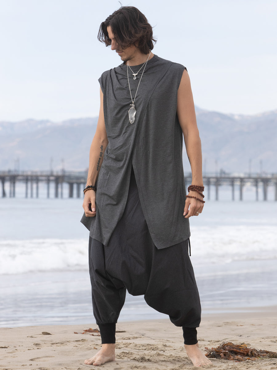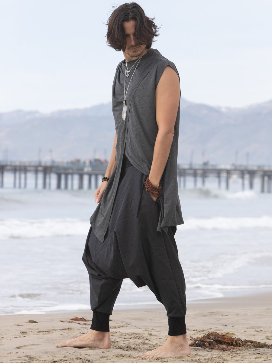 Stone-gray urban drop pants from a very durable fabric. The material has a barely visible stripes and it's quite soft to touch.